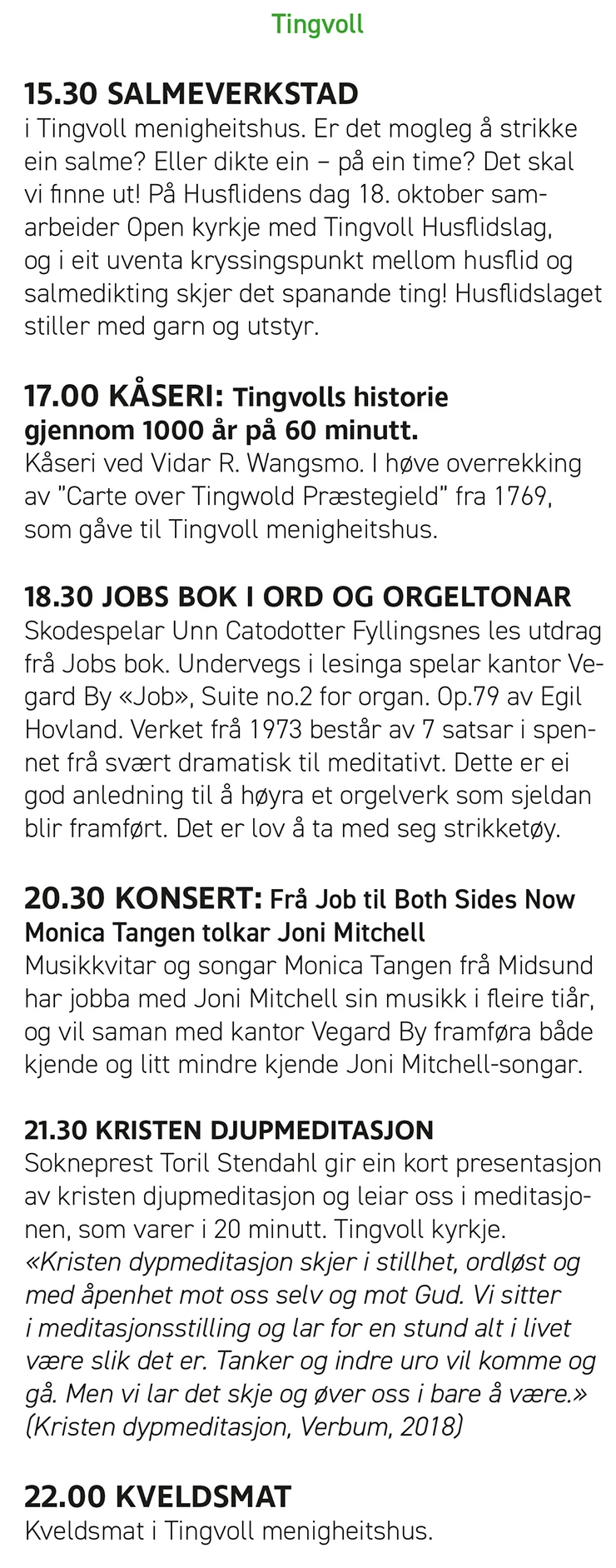 17:00 - 18:30(GMT+01:00) 06nov17:0018:30Åpen kirkeTingvoll kirke, Prestgardsvegen 48, 6630 Tingvoll